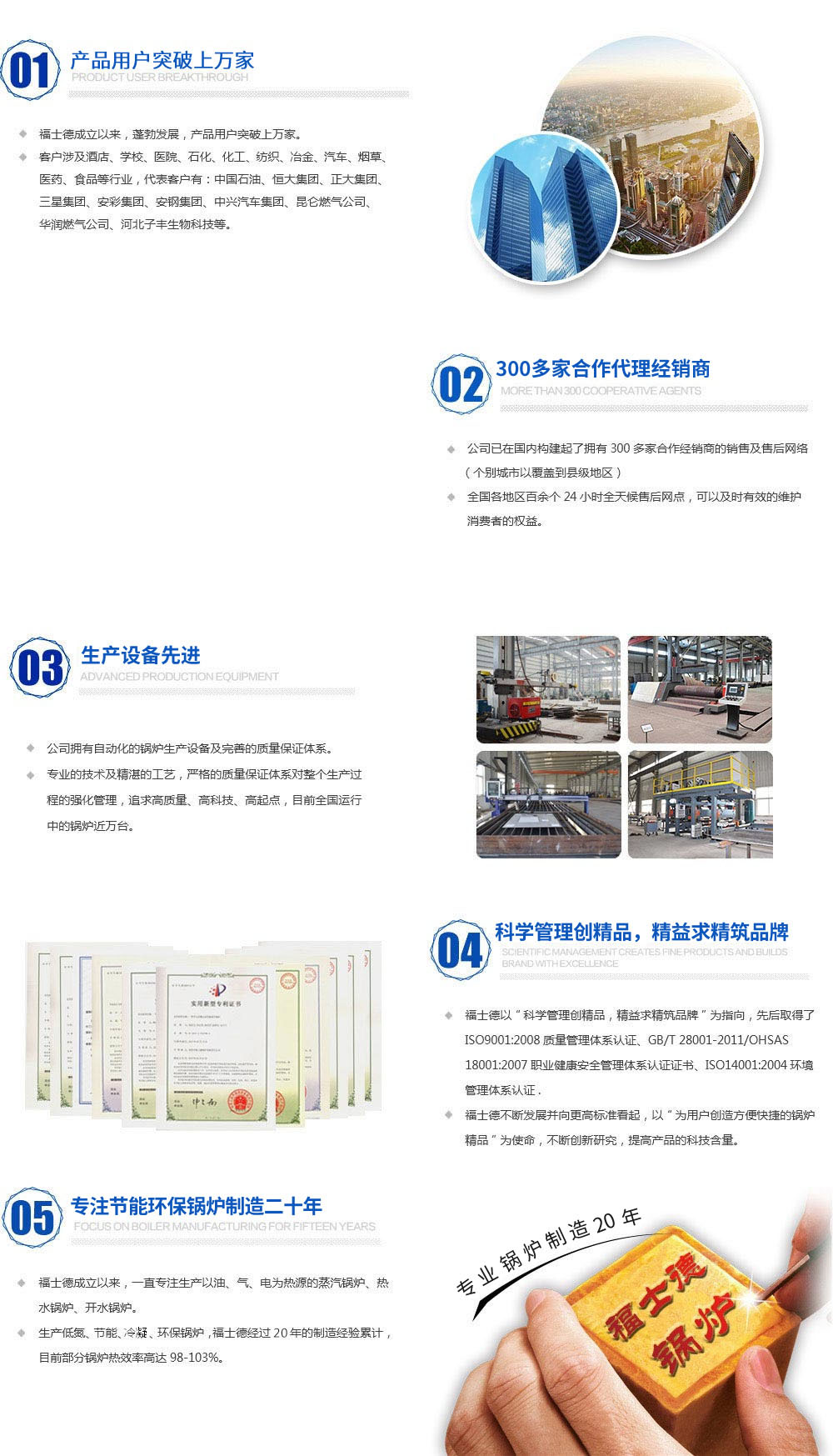 福士德成立以來,一直專注生產以油、氣、電為熱源的蒸汽鍋爐、熱水鍋爐、開水鍋爐,生產低氮、節能、高效、環保鍋爐,福士德經過15年的制造經驗累計,目前部分鍋爐熱效率高達98-103%。擁有自動化的鍋爐生產設備及完善的質量保證體系,專業的技術及精湛的工藝,嚴格的質量保證體系對整個生產過程的強化管理,追求高質量、高科技、高起點,目前全國運行中的鍋爐近萬臺,客戶涉及酒店、學校、醫院、石化、化工、紡織、冶金、汽車、煙草、醫藥、食品等行業,代表客戶有:中國石油、恒大集團、正大集團、三星集團、安彩集團、安鋼集團、中興汽車集團、昆侖燃氣公司、華潤燃氣公司、河北子豐生物科技......